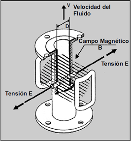 Un caudalímetro electromagnético consiste en un carrete del diámetro de la tubería embridado a ésta sobre el que va montada una bobina por la que circula corriente eléctrica, produciéndose así un campo magnético. Según la ley de Faraday, cuando un conductor eléctrico (en nuestro caso el agua) se mueve en un campo magnético se induce una tensión en el conductor. La tensión inducida se toma en dos electrodos y es proporcional a la velocidad del agua. Con el valor de velocidad y la sección dada por el diámetro de la tubería se calcula entonces el caudal.